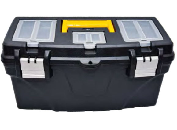 Caixa plástica para ferramentas, 12 ou 16 polegadas, corpo, bandeja interna, travas e tampa em polipropileno injetado, compartimentos superiores com tampa de plástico transparente, alça de plástico rígido