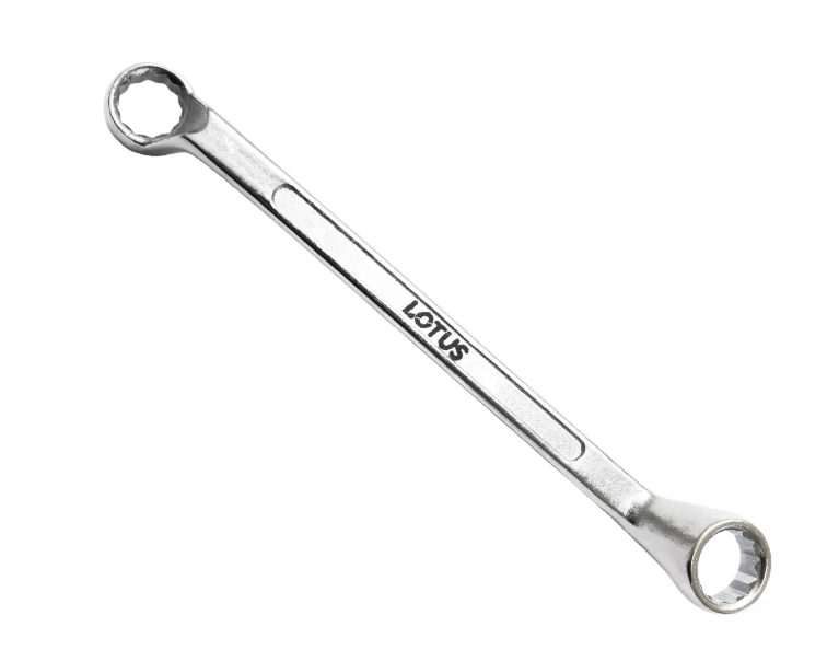 Chave estrela, em aço carbono forjado, 100% endurecido e temperado, cromada fosca, painel em baixo-relevo, com duas bocas estrelas de medidas diferentes, empacotadas a granel.