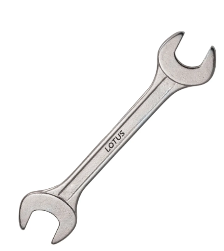 Chave fixa, em aço carbono forjado, 100% endurecido e temperado, cromada fosca, painel em baixo-relevo, com duas bocas fixas de medidas diferentes, empacotadas a granel.
