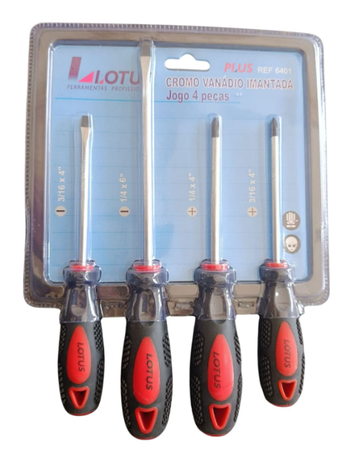 Jogo com 4 chaves Philips/Fenda, com haste em aço liga cromo vanádio niquelado, injetada diretamente sob a lâmina, ponta imantada e cabo bicolor moldado em borracha termoplástica (TPR) com orifício para pendurar, resistente a ácidos, solventes e a impactos. Possui 2 chaves de fenda (3/16×4” e 1/4×6”) e 2 chaves Philips (1×4” e 2×4”). Qualidade Plus, excelente para trabalhos profissionais pesados.