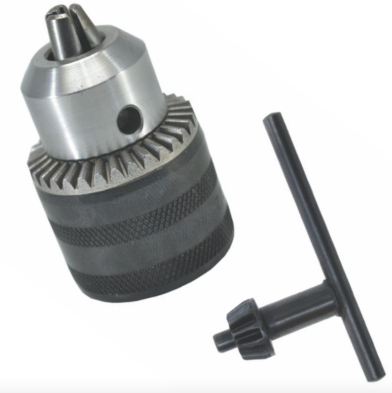 Mandril com chave, capacidade mínima 1/16″” (Aprox. 1,5mm), com coroa dentada apoiada sobre esferas, para facilitar a abertura e o fechamento das castanhas, castanhas de aço carbono temperado, para adaptar em furadeiras profissionais.